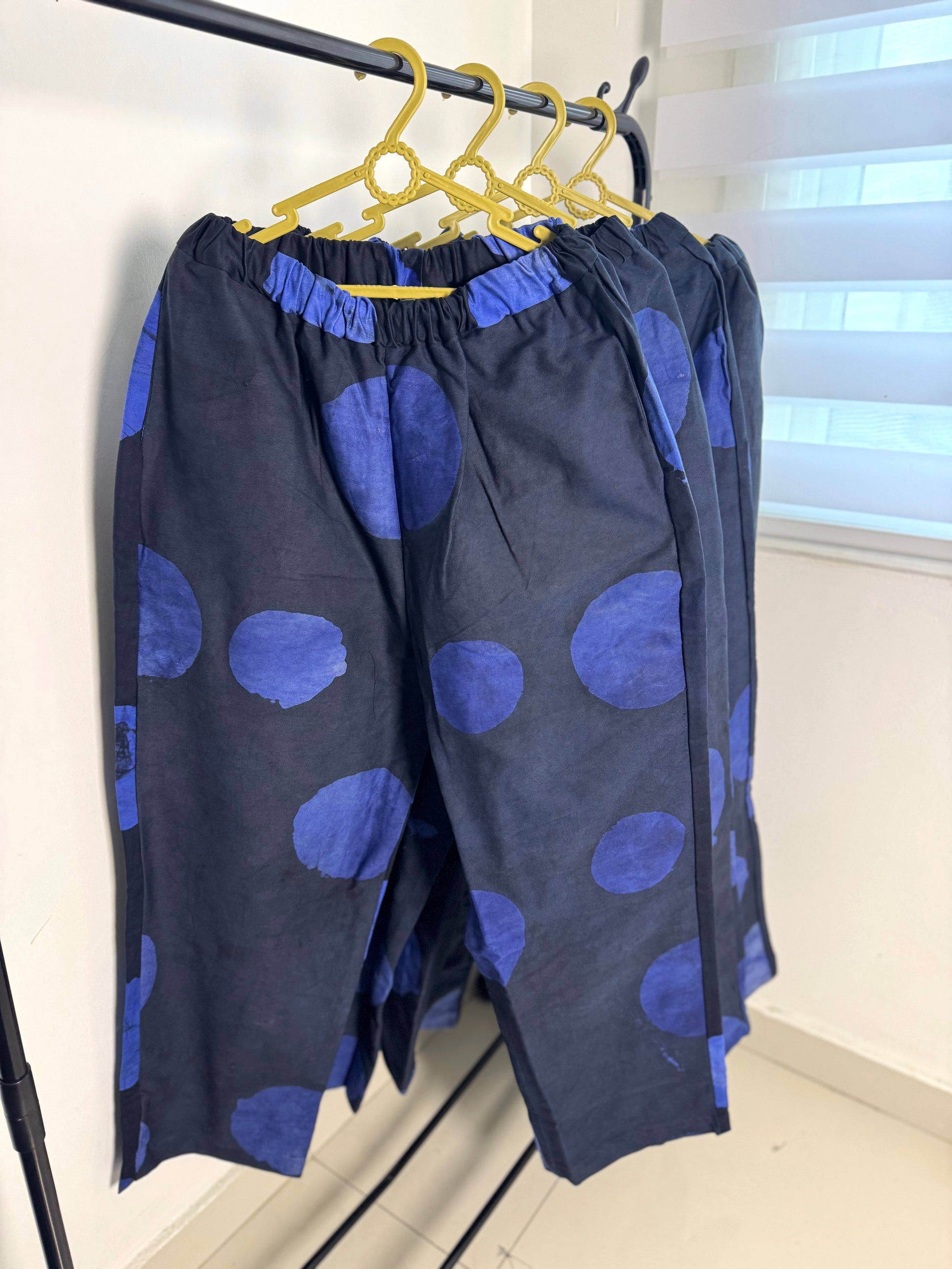 Effortlessly stylish and comfortable, these hand-dyed Adire trousers are made from 100% breathable cotton. Designed for a relaxed fit, they feature an elastic waist band and deep pockets - perfect for any occasion.